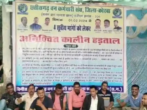 कोरबा में वन कर्मचारियों की अनिश्चितकालीन हड़ताल:सुबह से लंबित 4 मांगों को लेकर किया प्रदर्शन, रिक्त पदों पर संविदा नियुक्ति का विरोध