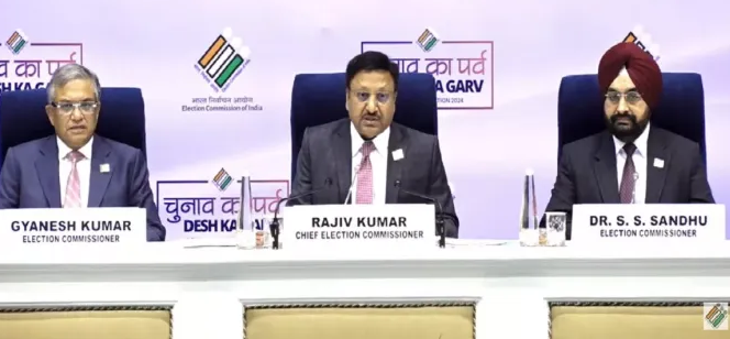 नई दिल्ली।भारत निर्वाचन आयोग ने लोकसभा चुनाव 2024 की तारीखों के एलान कर दिया है। सात चरणों में लोकसभा के चुनाव होंगे, जबकि 4 जून को नतीजों का एलान होगा। मुख्य चुनाव आयुक्त राजीव कुमार और चुनाव आयुक्त ज्ञानेश कुमार व सुखबीर सिंह संधु भी मौजूद हैं। मुख्य चुनाव आयुक्त राजीव कुमार ने बताया कि देश में 97 करोड़ रजिस्टर्ड मतदाता हैं। जिनमें से 49.7 करोड़ पुरुष और 47 करोड़ महिलाएं हैं। वहीं, 1.82 करोड़ मतदाता पहली बार मतदान करेंगे। हालांकि, 21.50 करोड़ युवा मतदाता चुनाव में हिस्सा लेंगे।