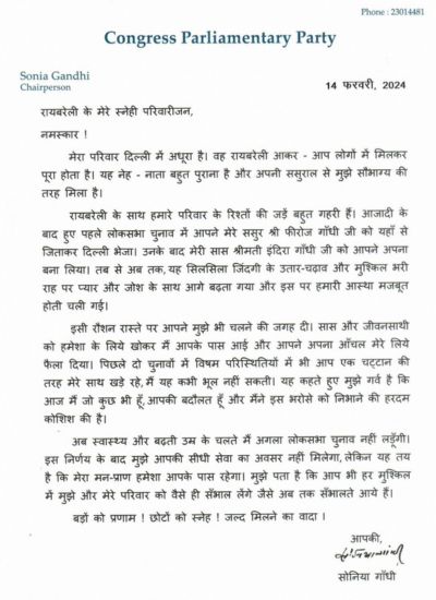 उन्होंने आगे लिखा कि अब स्वास्थ्य और बढ़ती उम्र के चलते मैं रायबरेली से अगला लोकसभा चुनाव नहीं लड़ूंगी। इस निर्णय के बाद मुझे आपकी सीधी सेवा का अवसर नहीं मिलेगा, लेकिन यह तय है कि मेरा मन-प्राण हमेशा आपके पास रहेगा। मुझे पता है कि आप भी हर मुश्किल में मुझे और मेरे परिवार को वैसे ही संभाल लेंगे जैसे अब तक संभालते आए हैं।