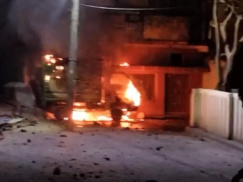 उपद्रवियों ने थाने के पास पथराव के बाद गाड़ियों में आग लगा दी थी।